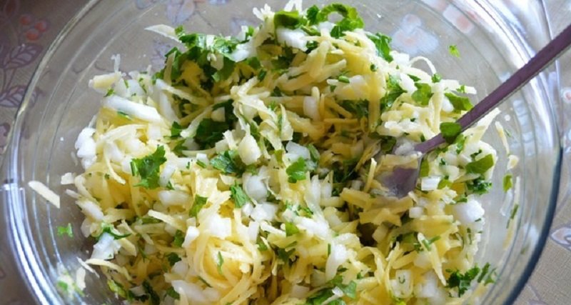 Cebulę obierz i posiekaj drobno. Wymieszaj ją w jednej misce z ziemniakami. Następnie dodaj posiekaną natkę pietruszki i ponownie wymieszaj składniki.