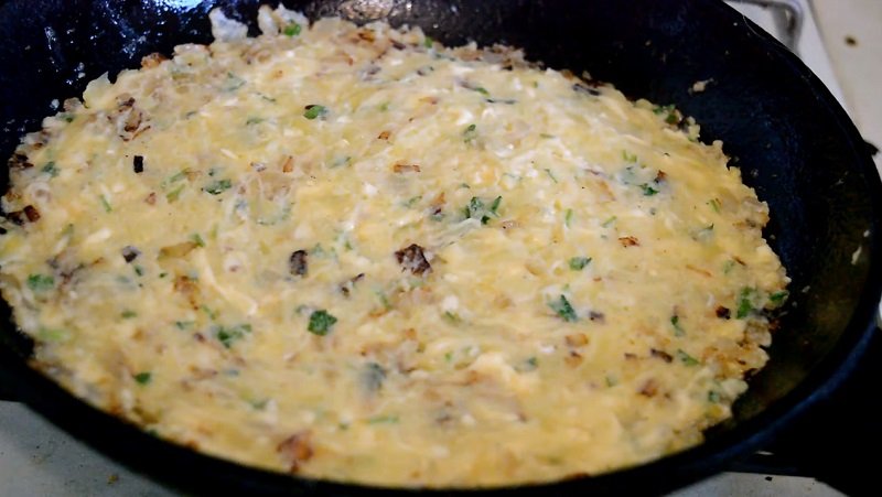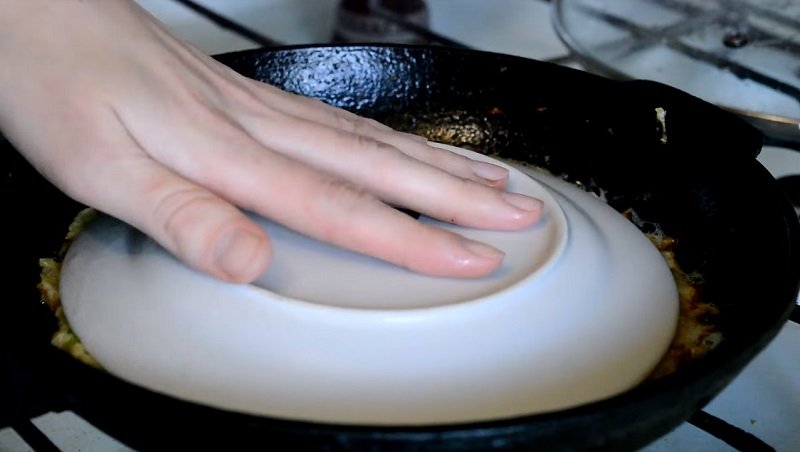 Po tym czasie placek należy przełożyć łopatką lub za pomocą talerza na drugą stronę i smażyć przez kolejne 15 minut.