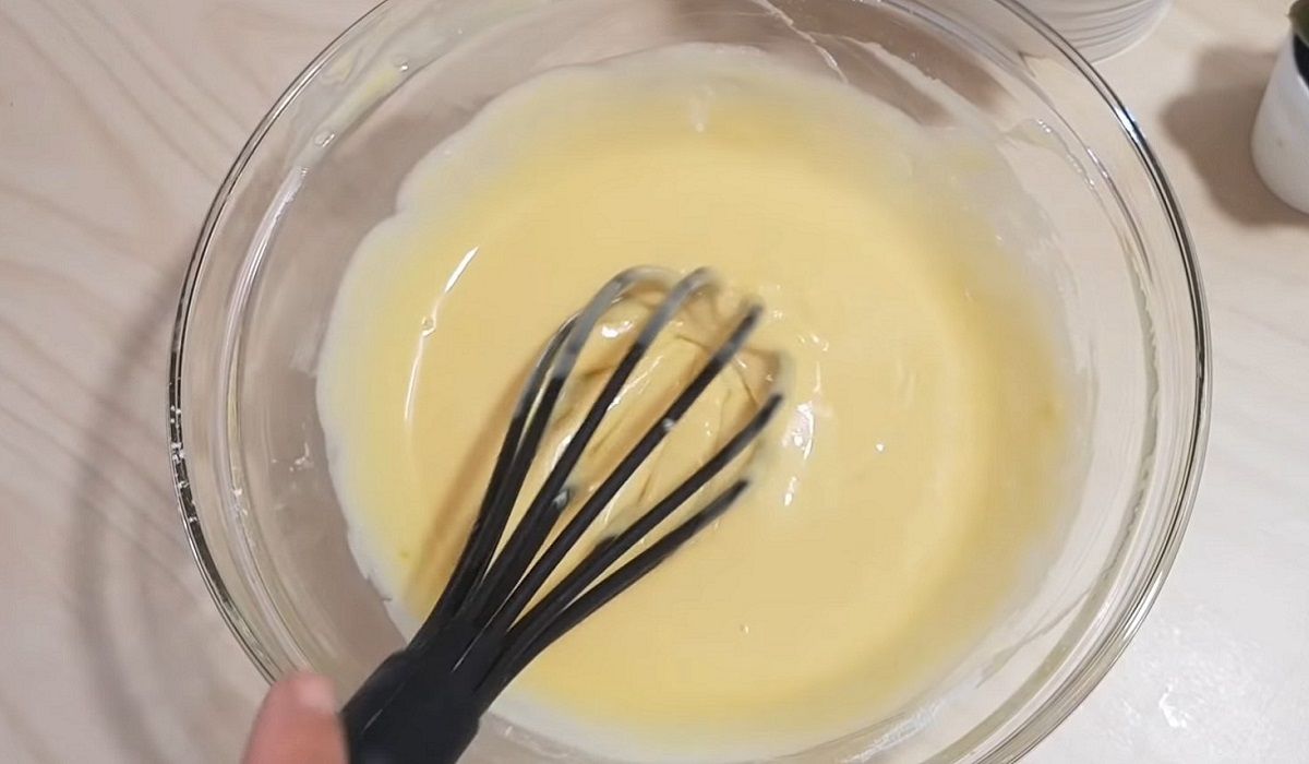 Całe jajka należy wymieszać z cukrem waniliowym i cukrem. Następnie dolewamy mleko i ponownie mieszamy, olej słonecznikowy i mieszamy.