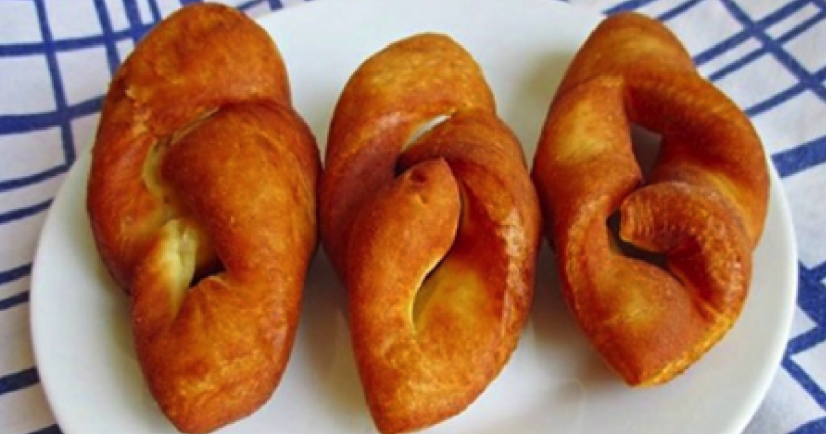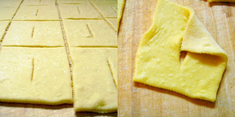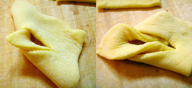 Rozwałkuj na stolnicy ciasto na około 0,5 cm i wykrój z niego prostokąty. Na każdym kawałku zrób nacięcie na środku i wywiń prze nie jeden róg powstałego prostokąta (trochę jak zrobienie faworka do połowy). Usmaż w głębokim, rozgrzanym oleju roślinnym.