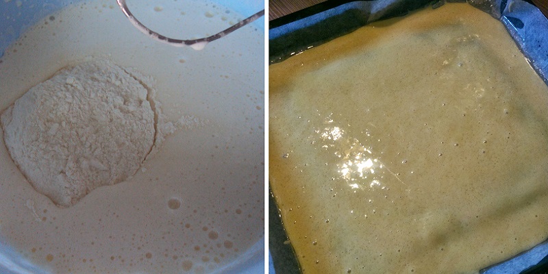 Do tak ubitej masy przesiewamy mąkę i skrobię ziemniaczaną. Mieszamy ją mikserem na małej prędkości. Tak przygotowane ciasto przelewamy na blaszkę do pieczenia o wymiarach 20 x 30 cm, na którą wyłożyliśmy wcześniej pergamin.