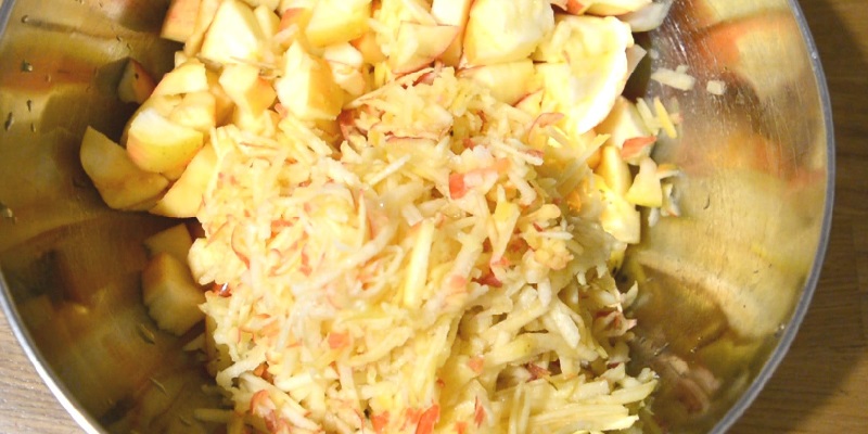 Ciasto pieczemy w 175 stopniach przez około 25 minut. W tym czasie przechodzimy do opłukiwania jabłek. Obieramy je i usuwamy środek. Całość ścieramy na tarce i przenosimy do rondla. Dodajemy do niego pozostałe masło i gotujemy na małym ogniu przez 2 do 3 minut.