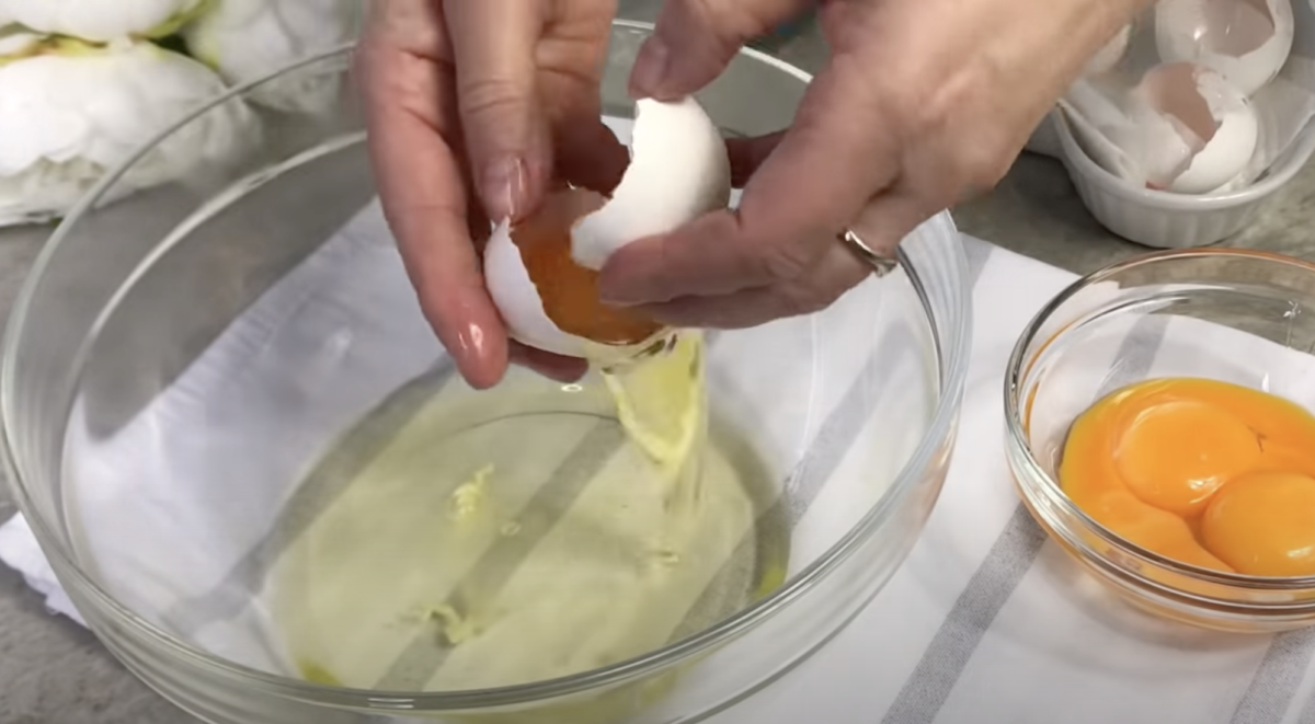 Oddziel białka i żółtka. Białka ubij ze szczyptą soli i cukru na sztywną pianę. Ręcznie wymieszaj migdały z pianą.