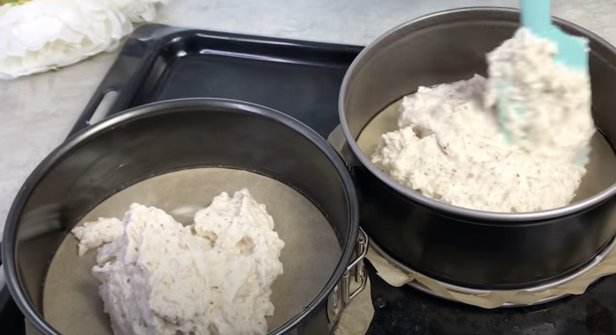 Podziel masę na pół. Każdą część ułóż w osobnej foremce wyłożonej papierem do pieczenia.