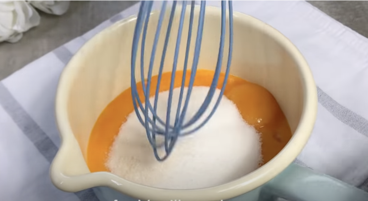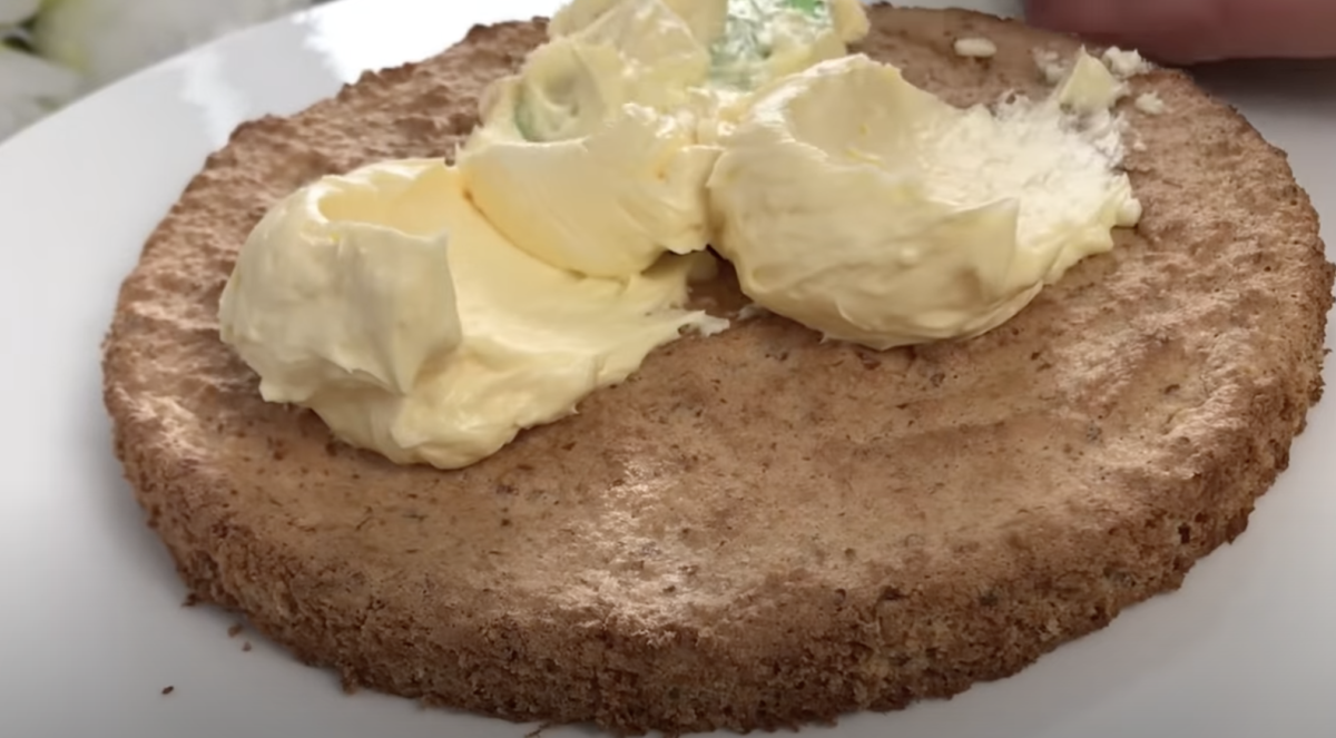 Piecz przez 20-25 min w 180 C. Pozostaw do ostygnięcia, a następnie ostrożnie oddziel od krawędzi formy i wyjmij. Wymieszaj żółtka z cukrem i cukrem waniliowym trzepaczką, dodaj śmietanę i przenieś na ogień. Ugotuj gęsty krem, ostudź go pod folią.