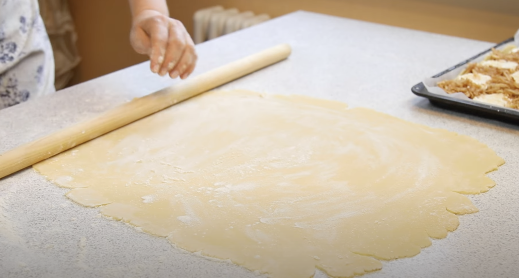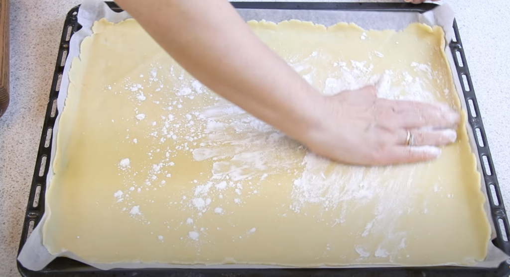 Jedną połówkę umieść na papierze do pieczenia w formie. Może posypać jeszcze mąką lub skrobiami.