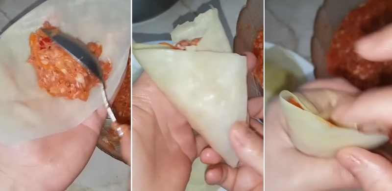 Przygotowując gołąbki należy porcję mielonego mięsa ułożyć na liściu kapusty, który następnie trzeba zwinąć w trójkąt.