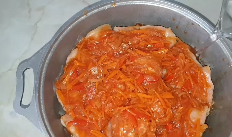 Całość gotować na wolnym ogniu. Wierzch posypać umytymi i posiekanymi pomidorami, liśćmi laurowymi, a także ulubionymi przyprawami. Danie gotować w całości tym razem przez około 40 minut.