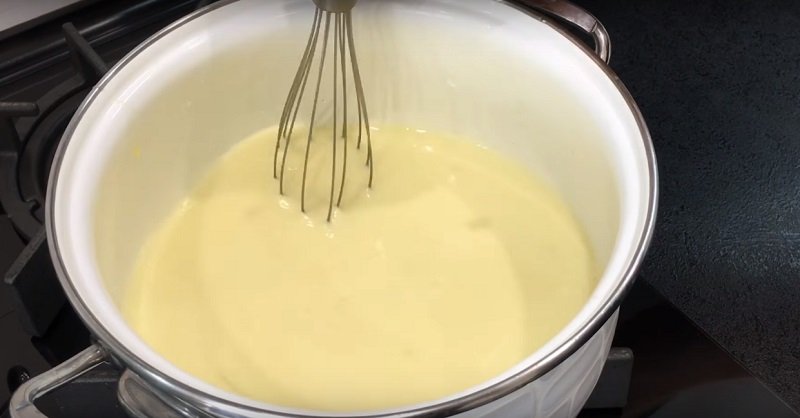 W drugim garnku przygotuj polewę: wymieszaj wszystkie składniki i podgotuj aż do zgęstnienia. Masło pokrój w kostkę i ubij mikserem.