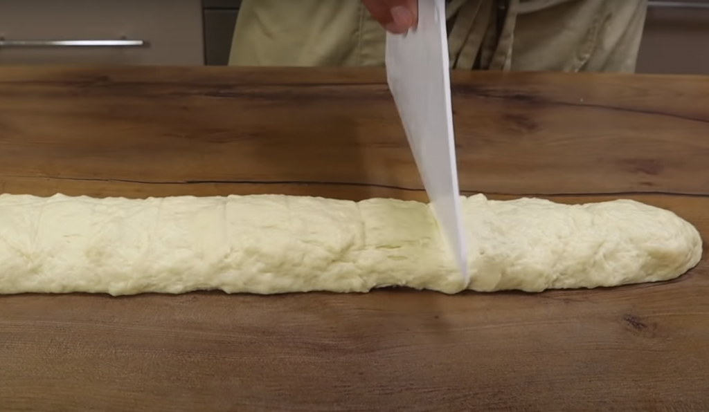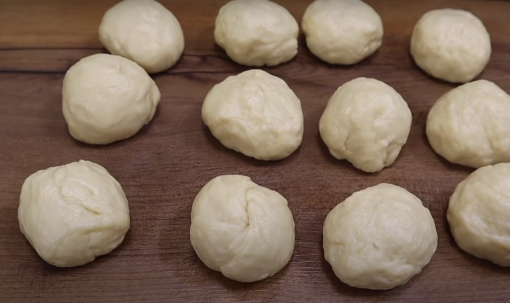 Następnie, gotowe ciasto uformować w kształt długiego wałka i podzielić na mniejsze, równe kawałki. Z każdego kawałka stworzyć zgrabną kulkę.