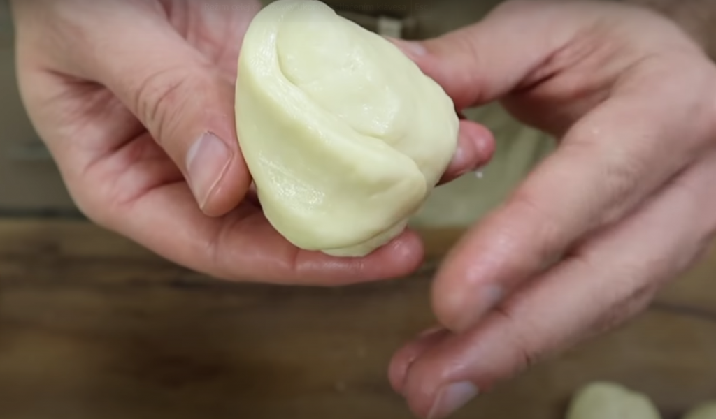 Każdą z kulek rozwałkować, by powstał cienki placek. Okrąg naciąć delikatnie do połowy, nałożyć nadzienie i zawinąć ostrożnie ciasto w stronę stworzonego nacięcia, tworząc bułeczki.