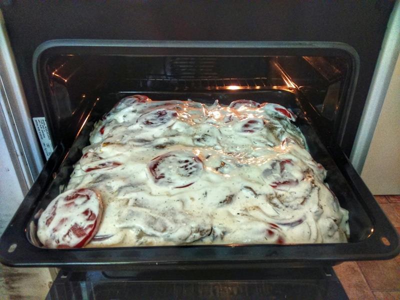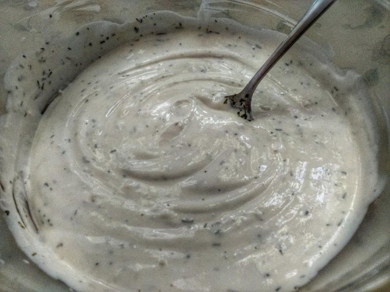 W tym czasie możemy przygotować sos. Mieszamy śmietanę z jogurtem, przeciśniętym przez praskę czosnkiem i ziołami. Doprawiamy solą i pieprzem. Po godzinie upieczone mięso zalewamy sosem i wkładamy jeszcze raz na chwilę do piekarnika.