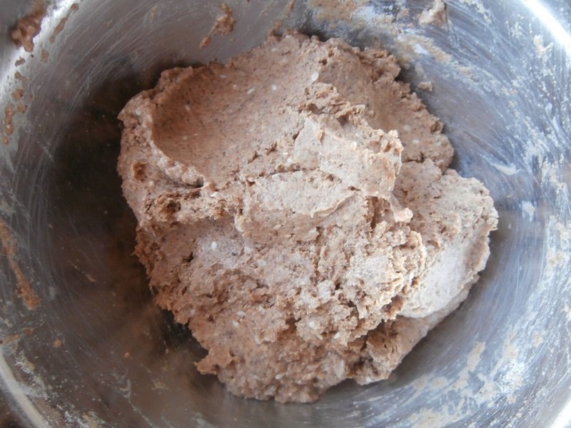 Do kefiru dodać sodę i sok z cytryny. Następnie dodajemy sól i cukier. Wszystko razem mieszany, aż kryształki cukru rozpuszczą się. Dodajemy do masy oliwę z oliwek, otręby owsiane (lub inne) oraz nasiona lnu i kolendry.
