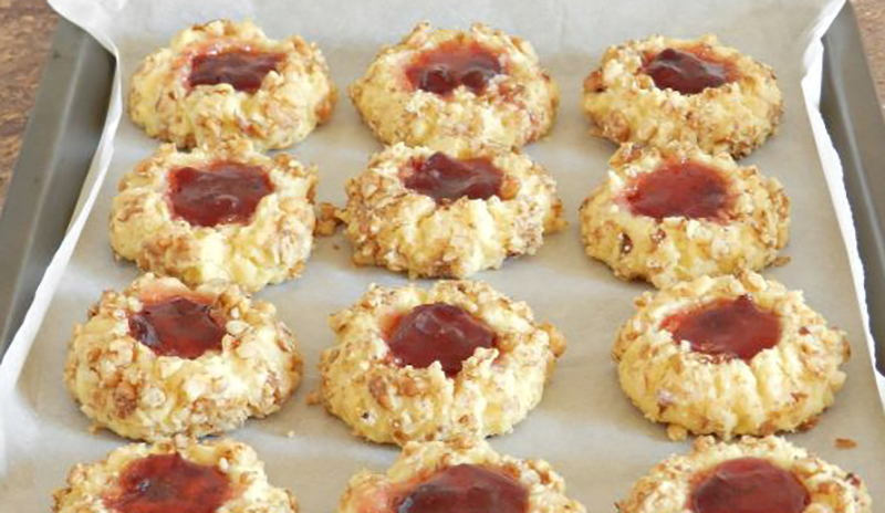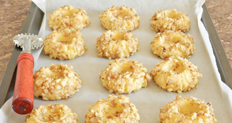 Wyjmij ciasto i uformuj z niego małe placki. W każdym zrób wnękę po środku. Połóż ciastka na blasze do pieczenia pokrytej pergaminem i posyp orzechami.