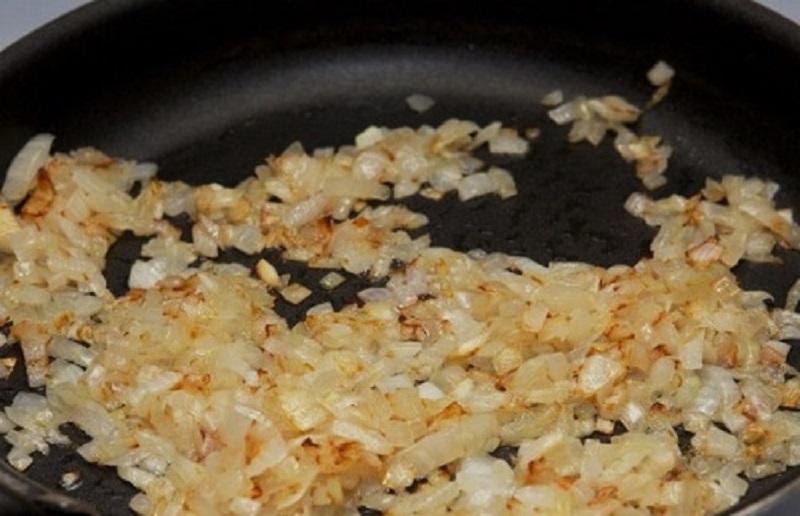 Cebulkę pokrój w kostkę oraz zeszklij na maśle. Przełóż ją do roztrzepanych, surowych jajek. Dopraw solą.