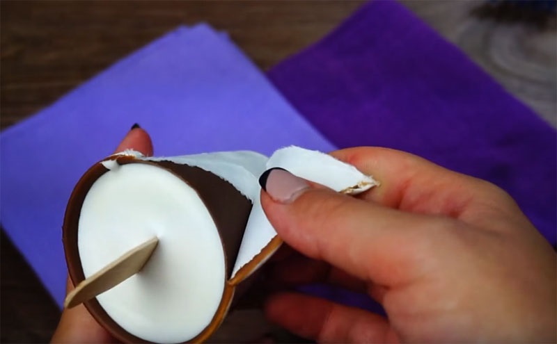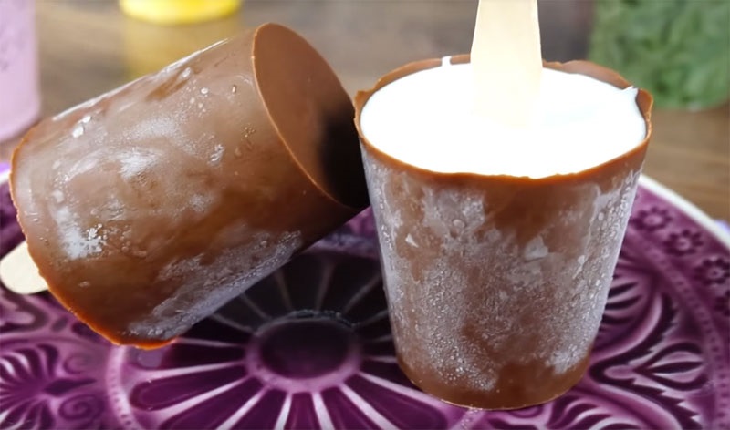 Później, umieść tak przygotowane kubeczki na 10 minut w zamrażalce. Przez ten czas czekolada będzie na tyle zamrożona, aby utrzymać się na ściankach kubków. W tym momencie możesz kubeczki napełnić lodową masą. W środek każdego włóż patyczek i umieść wszystkie porcje w zamrażalniku na czas około 5 godzin.
