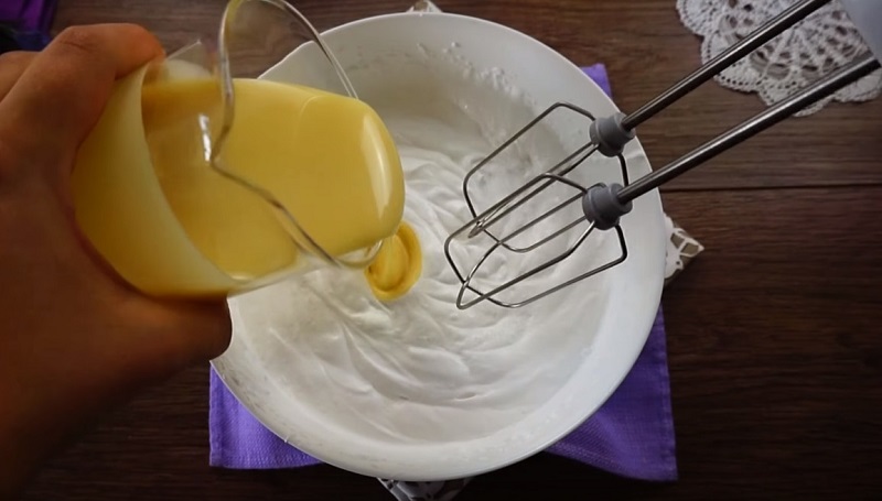 Słodką śmietankę wlej do miski i ubijaj dokładnie trzepaczką lub mikserem do momentu aż powstanie puszysta pianka. W dalszej kolejności dolewaj stopniowo skondensowane mleko ciągle mieszając, tak aby masa się nie ścięła.