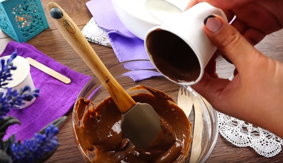 Kiedy czekolada będzie już płynna rozprowadź ją równomiernie po ściankach oraz na dnach kubeczków. Warstwa powinna być cienka, dlatego niepotrzebny nadmiar polewy zrzuć łyżką z powrotem do miski.