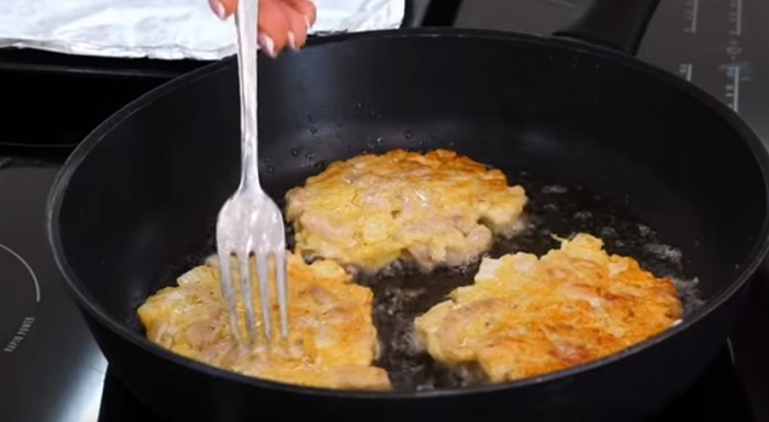 Umyj polędwiczki wieprzowe i pokrój na małe kawałki. Obierz i pokrój cebulę, ale niezbyt drobno. Przełóż pokrojone mięso do głębokiego naczynia, dodaj jajka, majonez, skrobię, a także odrobinę pieprzu i soli. Następnie dodaj posiekaną cebulę, dobrze wymieszaj.