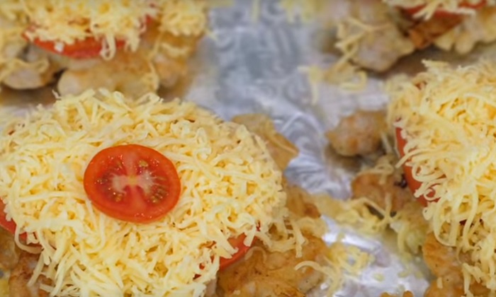 Pokrój pomidory w kółka, włącz piekarnik, aby się rozgrzał. Zetrzyj ser na drobnej tarce. Rozłóż 2 plasterki pomidorów na mięsie, umieść tarty ser na wierzchu. Piecz mięso w temperaturze 180 stopni przez 20-25 minut.