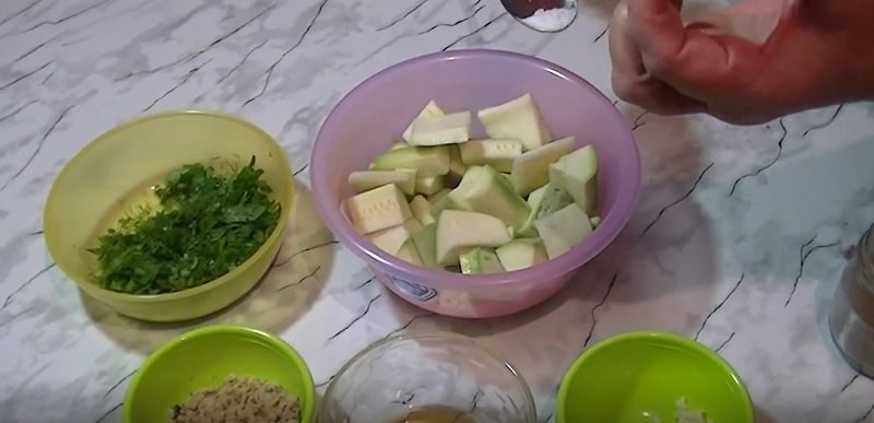 Cukinię obierz ze skórki. Pozbądź się pestek jeśli jest ich zbyt dużo. Jeśli jest ona młoda, możesz je zostawić. Następnie pokrój je w kostkę. Uwaga! Ważne, żeby kawałki były w podobnym rozmiarze, ale nie były zbyt małe.