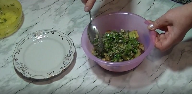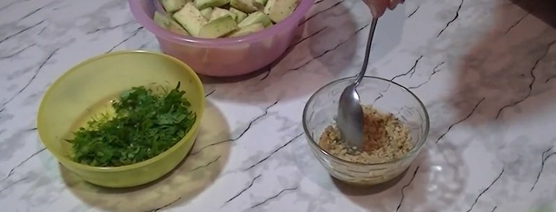 Umyj natkę pietruszki, a czosnek potraktuj praską. Posiekaj natkę i zmiażdż orzechy włoskie.