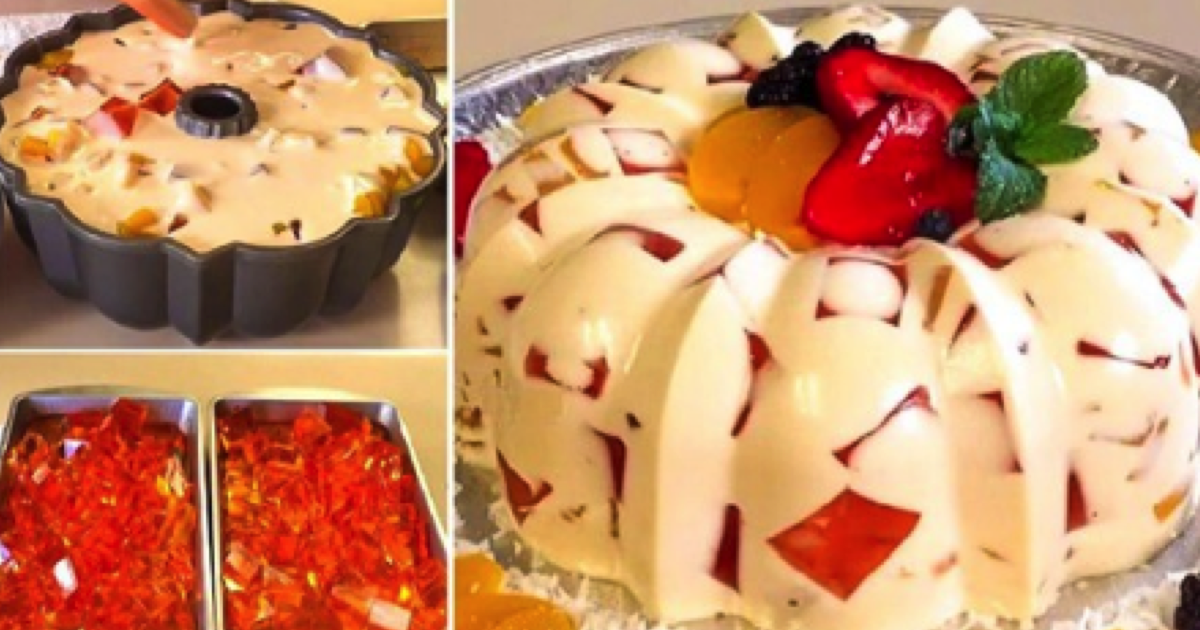 Czas wrócić do galaretek. Kroimy je w małe kostki, po czym przenosimy do formy i zalewamy je skondensowanym mlekiem połączonym z żelatyną.