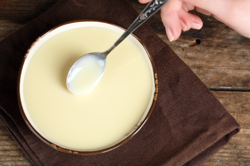 Do przygotowania podstawy jasnej części deseru, zalewamy 20 g żelatyny 50 ml wody i zostawiamy na 10 minut, żeby spęczniała. Następnie rozpuszczamy żelatynę w kąpieli wodnej lub kuchence mikrofalowej, po czym łączymy ze skondensowanym mlekiem.