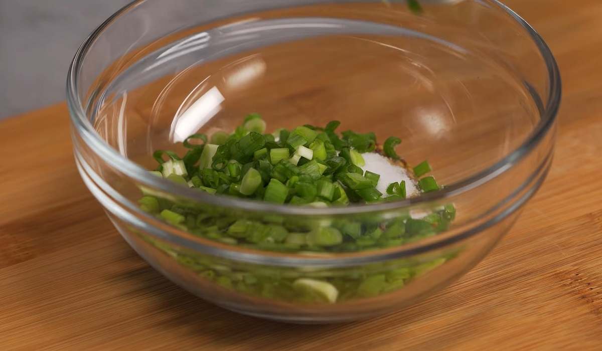 Krok 2 – Posiekaj szczypiorek, a następnie połącz go w osobnym naczyniu z musztardą, solą, octem i oliwą z oliwek. Dokładnie wymieszaj całość.