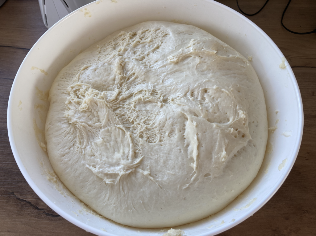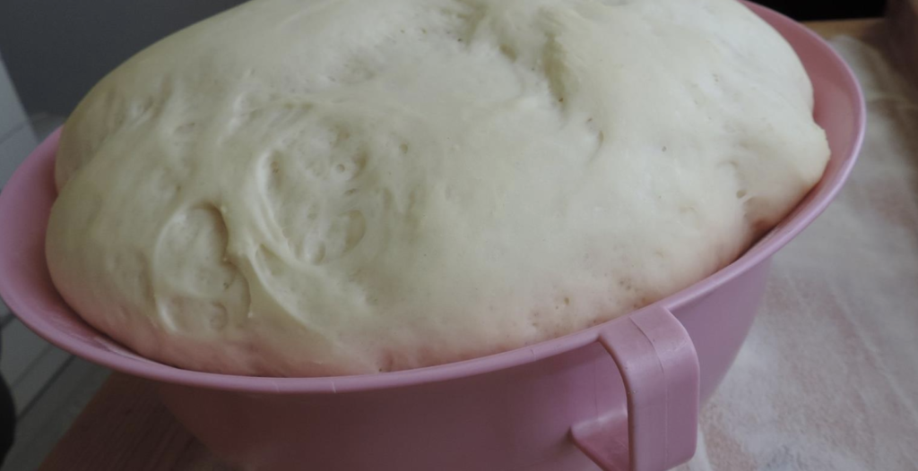 Ciasto wyrabiamy (nie dodajemy więcej mleka, jeśli trzymamy się podanych ilości) Ciasto będzie cieńsze, nie martw się. Dobrze wymieszaj łyżką… oprósz lekko mąką – przykryj ręcznikiem i odstaw w ciepłe miejsce na min. 1 godzina, nawet półtorej godziny. Dosłownie „wyciągamy” go z miski – jest jak pajęczyna – która też klei się do moich rąk.