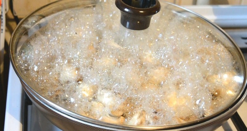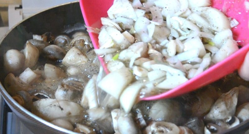Postaraj się, aby kawałki były podobnej wielkości. Grzyby duś ok 5 minut na suchej patelni, pod przykryciem.