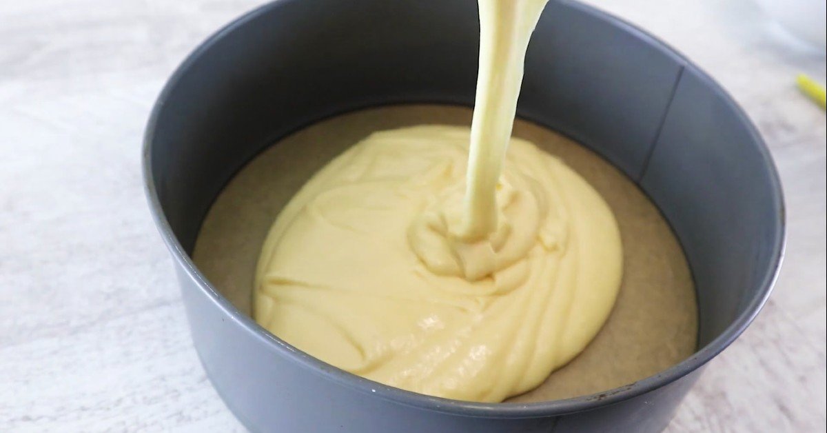 Przygotowaną formę do pieczenia (odpowiednia będzie np. tortownica) należy wyłożyć folią aluminiową lub papierem do pieczenia. Do foremki wlewamy ciasto.
