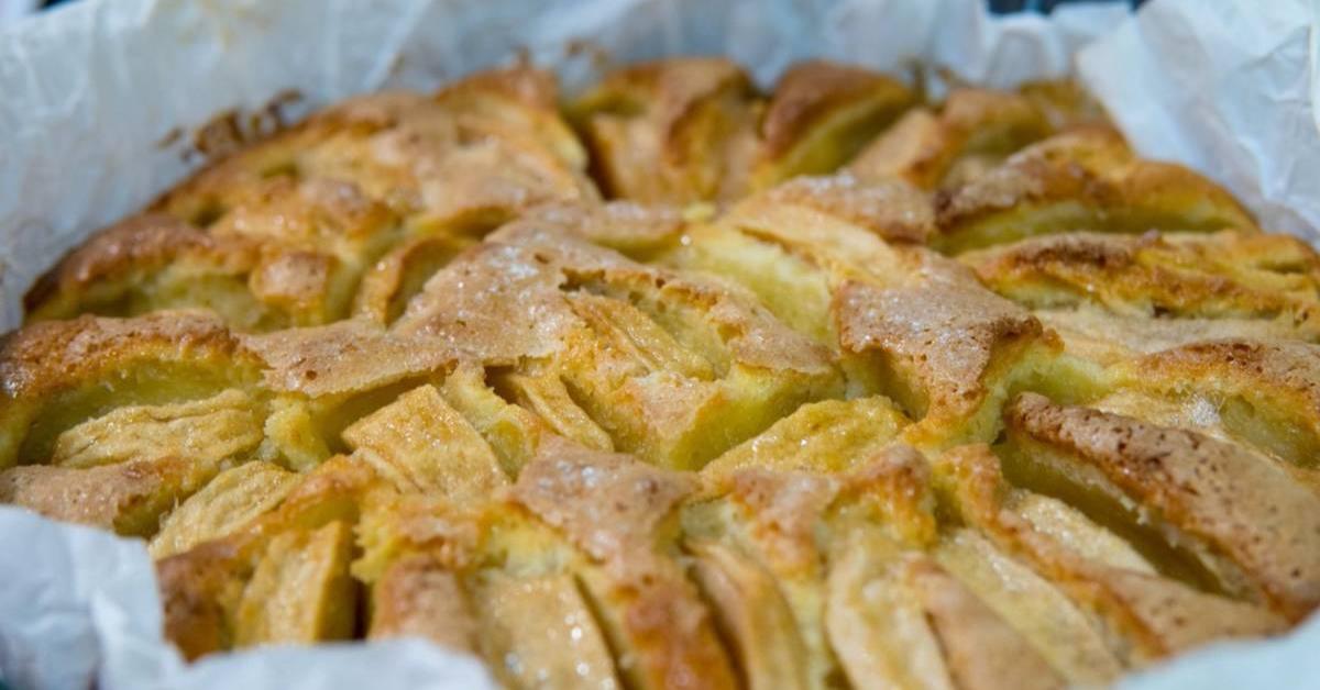 Pozostałą część rozpuszczonego masła wylewamy na jabłka i posypujemy trzema łyżkami cukru. Tak przygotowane ciasto pieczemy przez 35 minut w temperaturze 180 stopni.