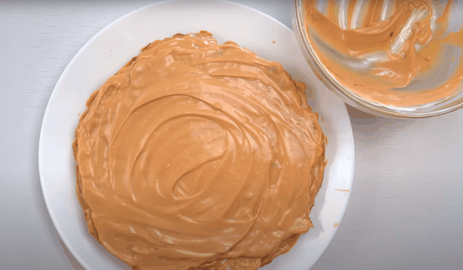 Każdą rozwałkowujemy na płaskie, okrągłe placki, które smażymy na lekko nagrzanej i suchej patelni przez około 1-2 minut z obu stron. Skondensowane mleko mieszamy ze śmietaną. Tak przygotowaną masą smarujemy równomiernie placki, układając jeden na drugim. Ostatnią warstwą powinien być krem.