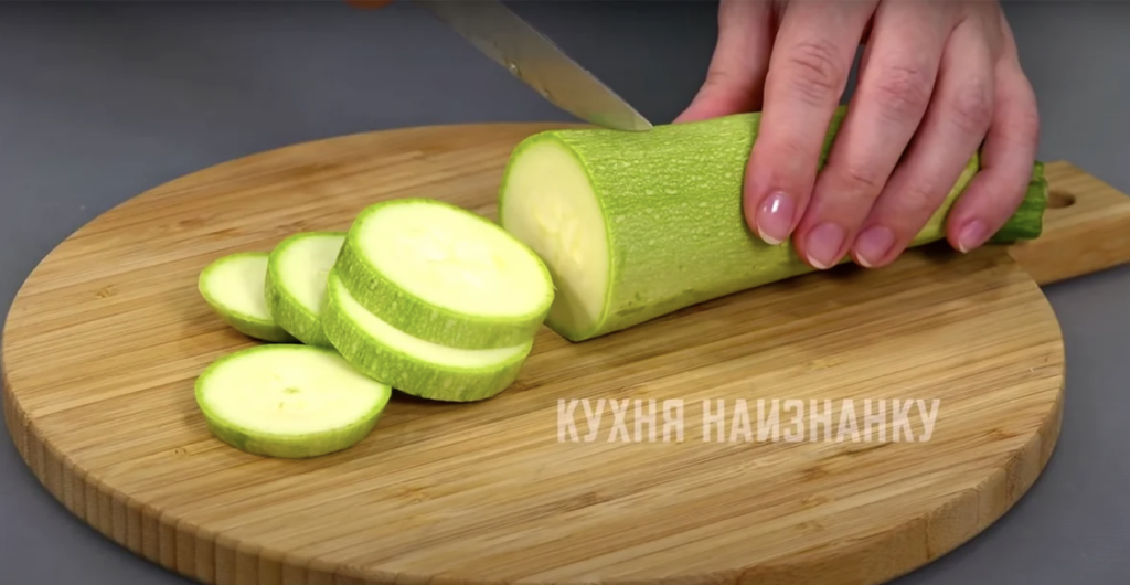 Cukinię pokrój w plastry o grubość 6-7 mm. Najlepiej przygotować to danie z młodej cukinii, ale nie jest to konieczne, wystarczy że w tym przypadku usuniesz tylko skórkę.