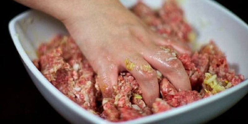 Do dużej miski włóż zmielone jagnięcinę i mostek wołowy. Dodaj do tego mieszankę sody i soku z cytryny i dokładnie połącz. Wyrabiaj mięso około 10 minut, aż będzie jednolite i lepkie.