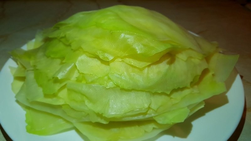 Najpierw przygotowujemy kapustę. W tym celu umieszczamy ją w mikrofalówce na 10 minut, ustawiając niską moc. Po upływie tego czasu, oddzielamy poszczególne liście i odcinamy z nich twardą część.