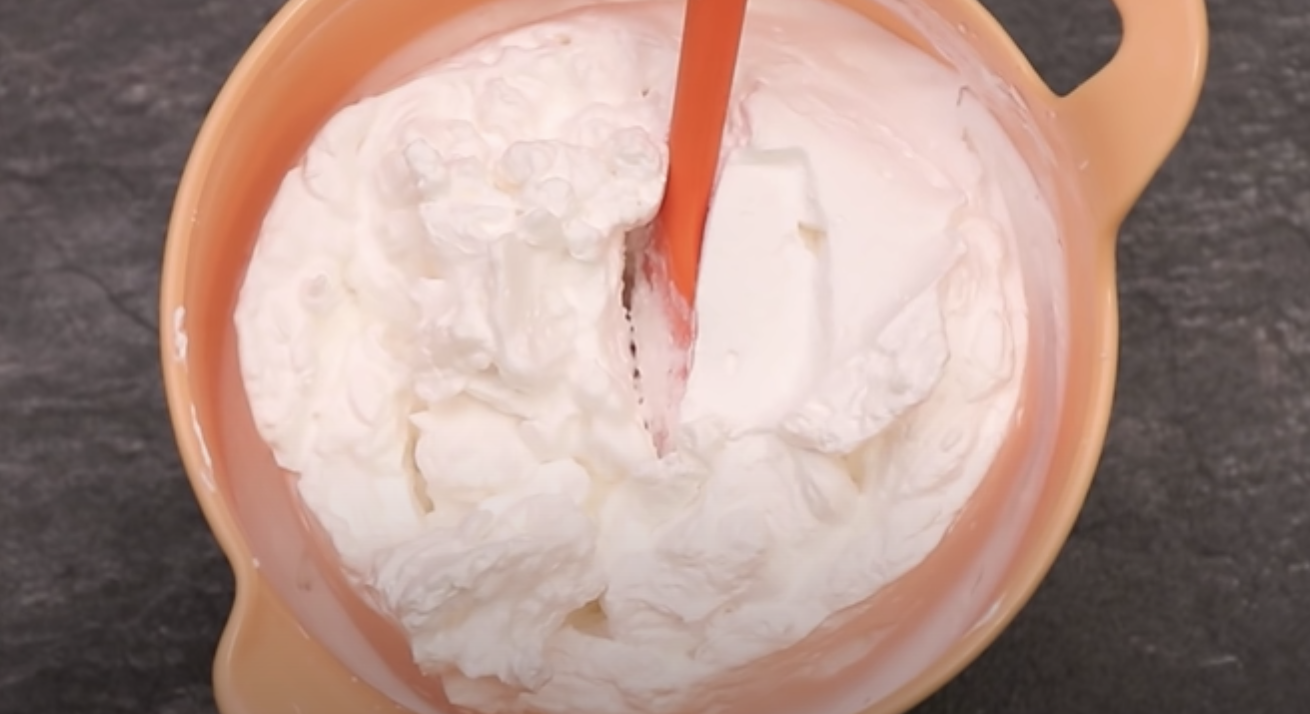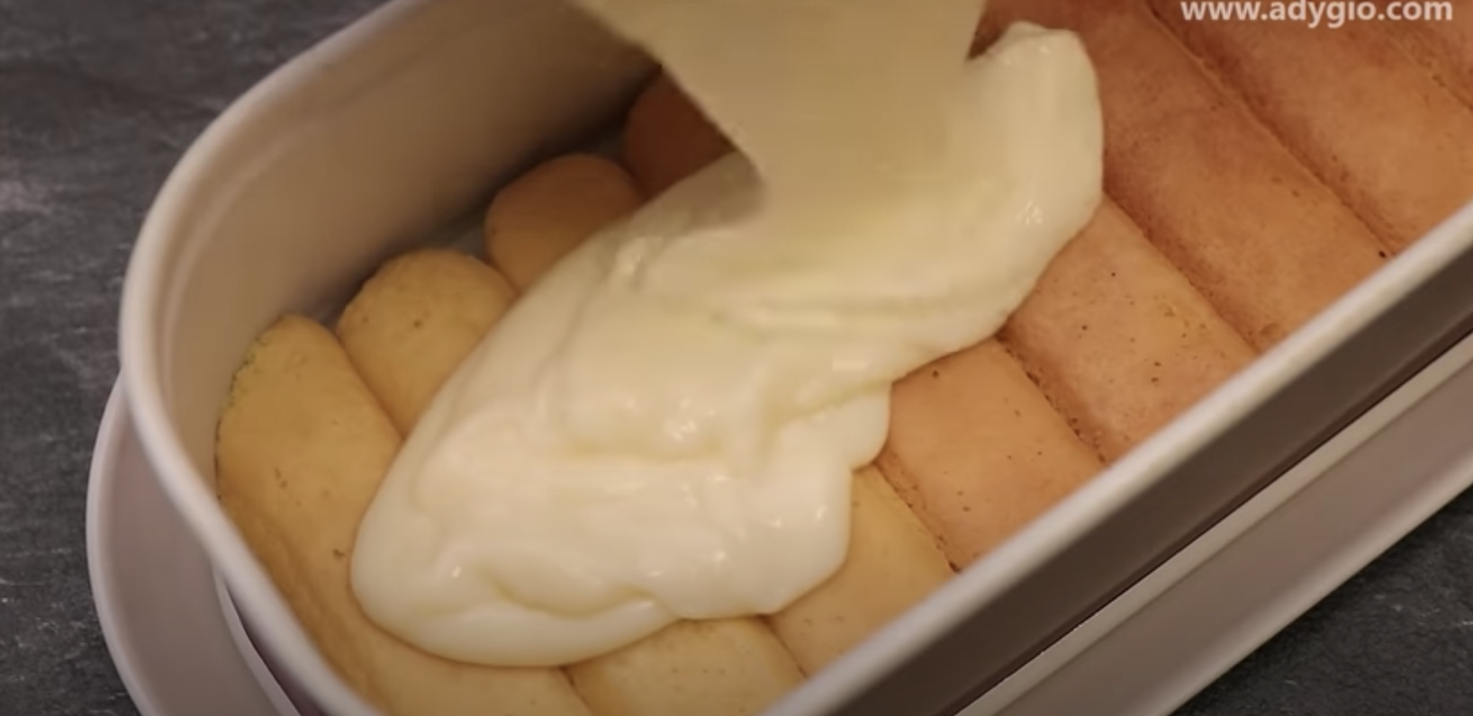Ubij śmietanę i ułóż na masie budyniu, wyrównaj powierzchnię. Ułóż kolejną warstwę biszkoptów namoczonych w mleku.