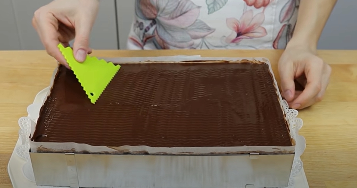 Polewę wylej na przygotowane ciasto i równomiernie rozprowadź. Możesz zrobić w polewie wzorki, np. widelcem lub specjalną łopatką do dekorowania z ząbkami.