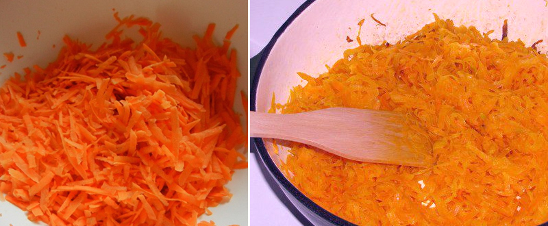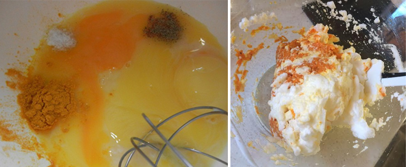 Marchewki odstawiamy do wystygnięcia. Oddzielamy białka od żółtek. W naczyniu, w którym planujemy połączyć wszystkie składniki ubijamy jajka z solą i/lub cukrem oraz przyprawami na puszystą masę. Dodajemy wystudzone marchewki.