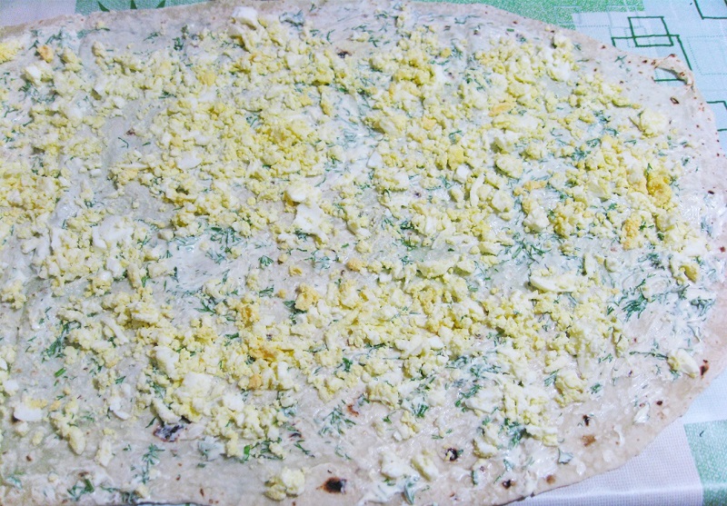 Ostatnią tortillę posmarować pozostałym sosem oraz posypać serem, całość ostrożnie zwinąć w rulon, a następnie odstawić do lodówki.