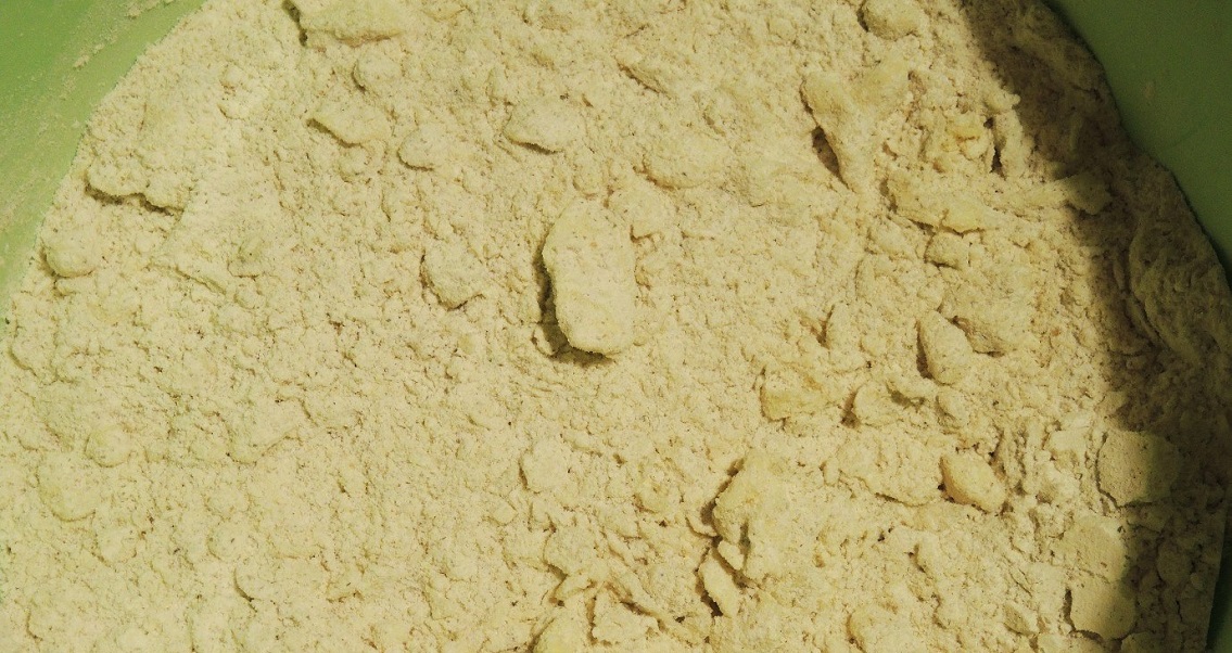 1: Mąkę przesiewamy przez sito z proszkiem do pieczenia. Masło kroimy w mniejsze kosteczki i mieszamy z mąką.