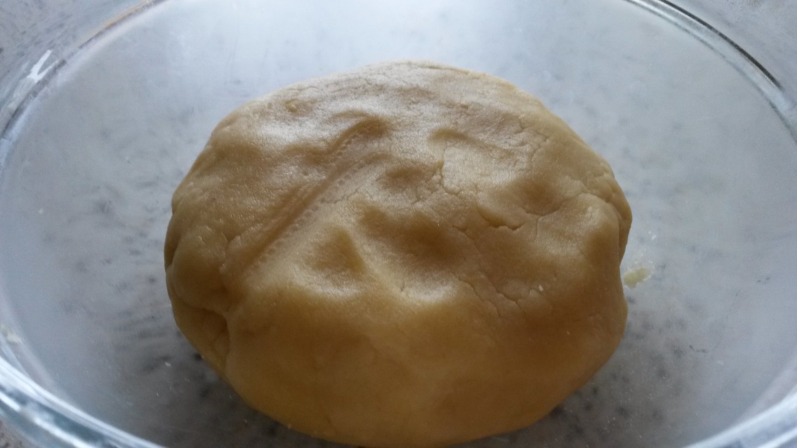2: Do powstałej masy dodajemy jajko oraz 100 g cukru, po czym dalej mieszamy. Ciasto powinno być plastyczne i miękkie. Formujemy je w kulę, zawijamy w folię spożywczą i wkładamy do lodówki na pół godziny.