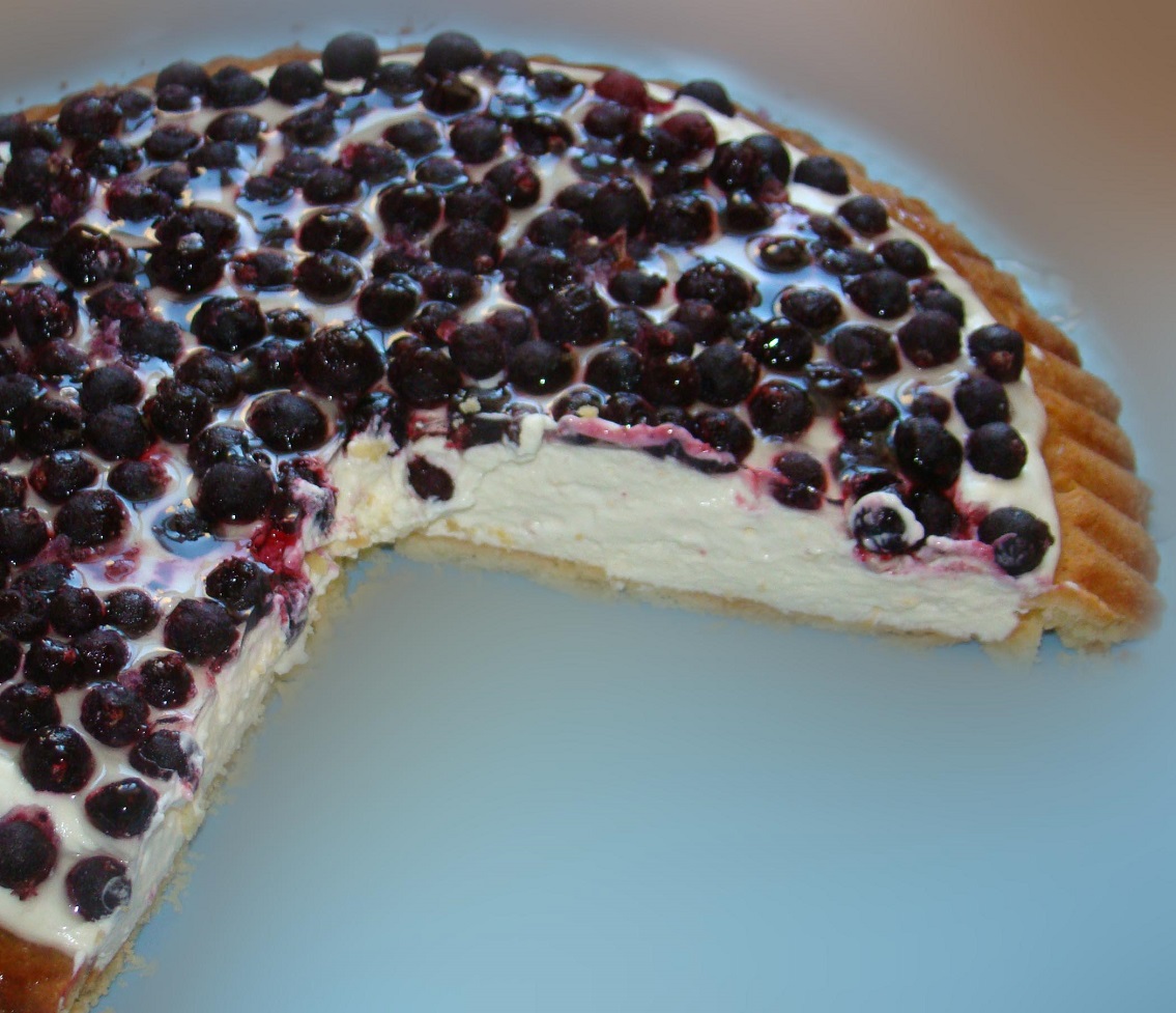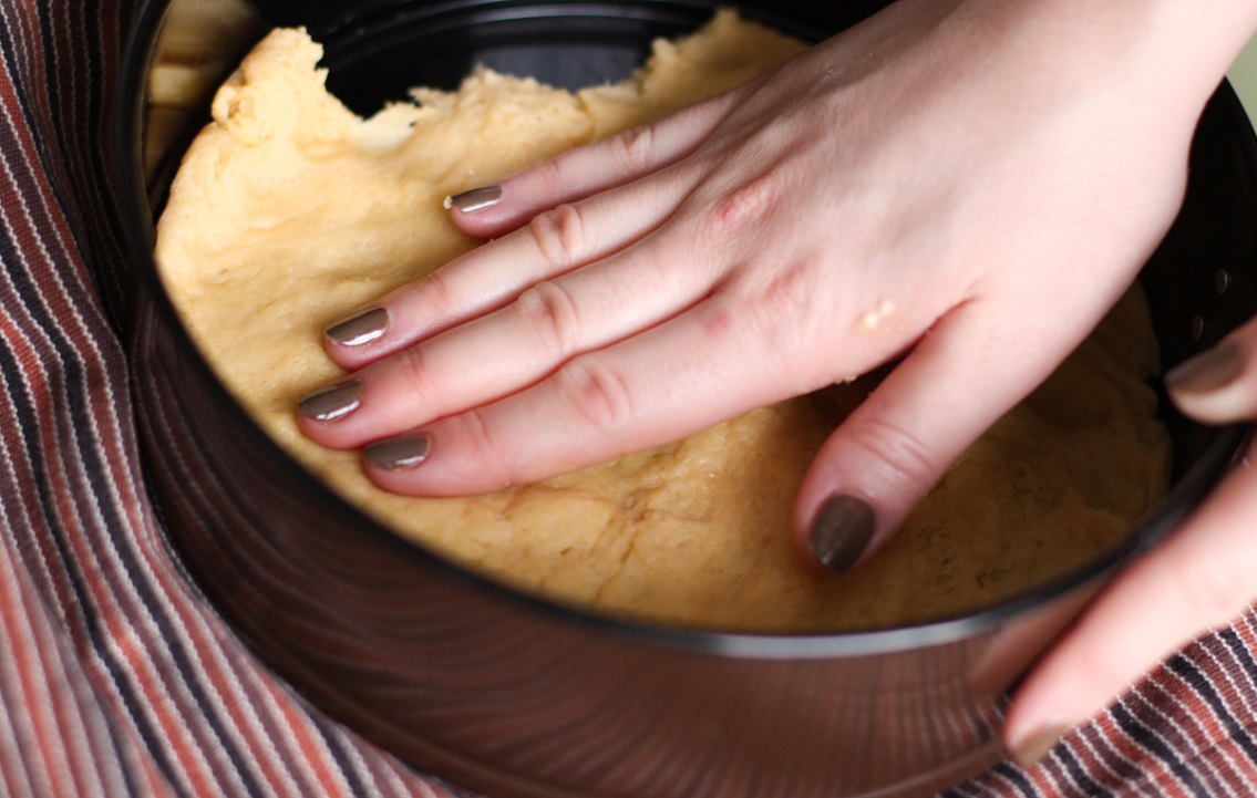 4: Wyciągamy ciasto z lodówki. Przekładamy je do foremki i ugniatamy palcami równomiernie pokrywając dno oraz boki foremki (na wysokość 4-5 cm). Wylewamy masę serową. Wierzch ciasta posypujemy owocami.