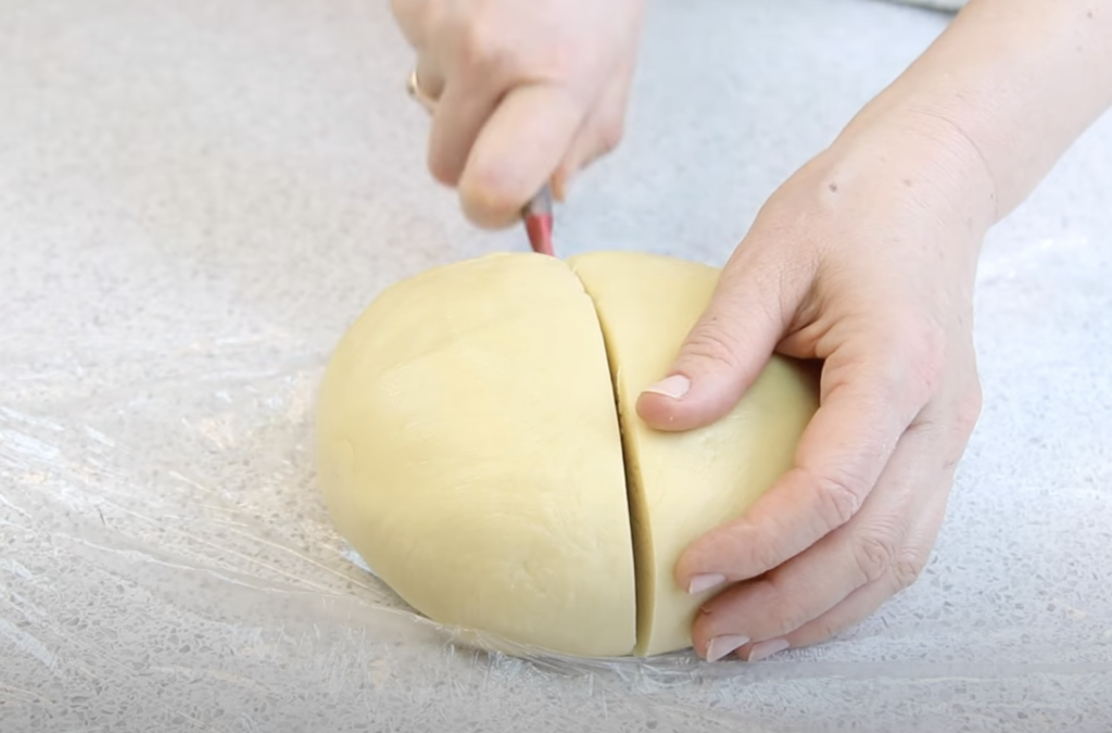 Ciasto owinąć folią spożywczą i schłodzić w lodówce w celu odpoczęcia i związania się masy. Proces ten powinien zająć około czterdziestu minut. Po tym czasie ciasto wyjąć i pokroić na dwie równe części.