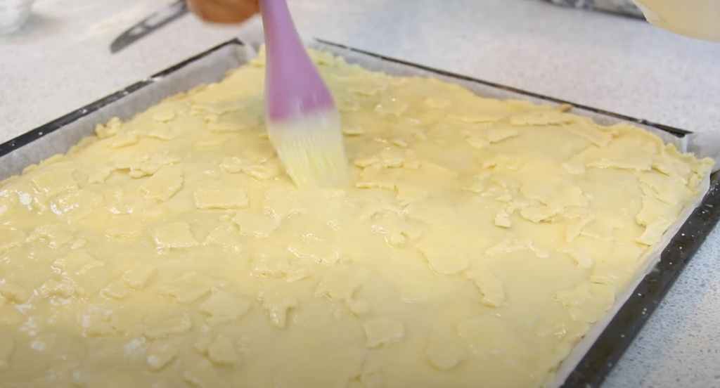 W przypadku, gdy ciasto ma tendencję do wystawania poza krawędzie blachy do pieczenia, warto je odpowiednio dociąć i ułożyć na wierzchu wypieku.