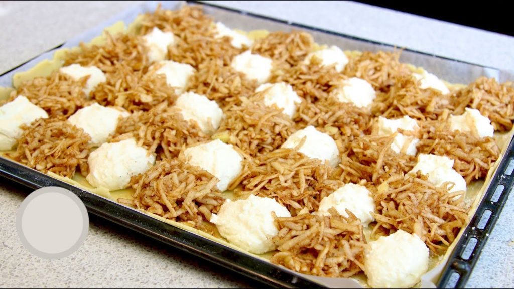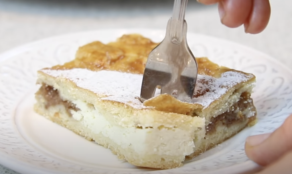 Na cieście stworzyć wzór szachownicy, czyli naprzemian układać łyżkę utartych jabłek z przyprawami oraz twarogu. Pozostałą część ciasta również rozwałkować, po czym delikatnym ruchem ułożyć na nadzieniu.