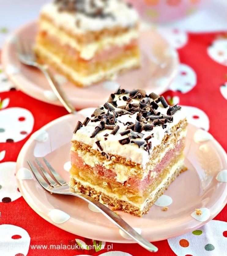 Kiedy ciasto stężeje, wylej na warstwę biszkoptów resztę galaretki, w której były moczone biszkopty. Wstaw ciasto do lodówki, aby stężało. Wyłóż na zastygniętą galaretkę drugą porcję masy budyniowej. Przykryj resztą ciasta biszkoptowego.