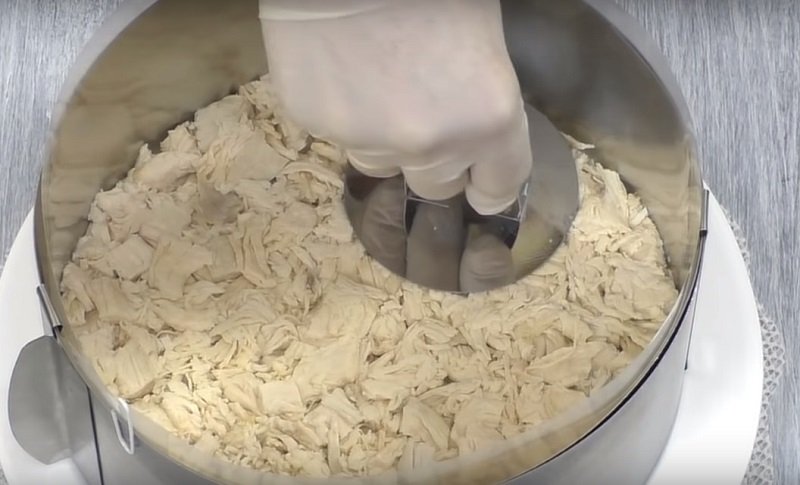 Do formowania sałatki można użyć pierścienia, np. od blachy do pieczenia (średnica ok. 20 cm). Pierwsza warstwa to kurczak.