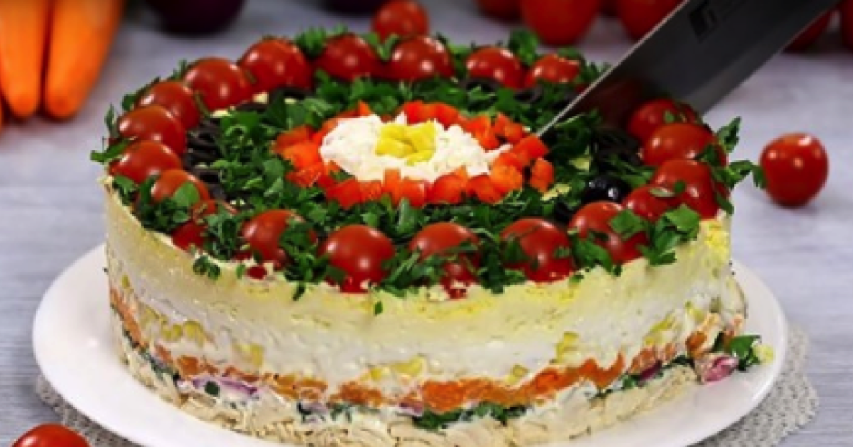 Przepyszna sałatka wielowarstwowa „gość przy stole”. Niezwykle efektowna i smaczna. Przepis wart zapisania.